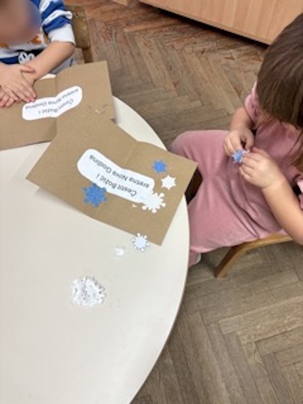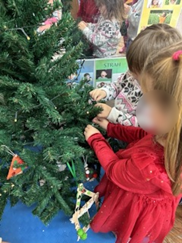 Posebnu pažnju posvetili smo razgovorima o emocijama koje prate obiteljske blagdane i božićnu tradiciju. Djeca su sudjelovala u kićenju bora, izradi božićnih ukrasa i čestitki za svoje obitelji. Učili smo pjesmice o svetom Nikoli te izvodili vježbe za ritam zvončićima. Također smo slušali puno skladbi kao što su Ples šećerne vile koju djeca jako vole slušati i skladbu Corelli: Pastorale ad libitum.