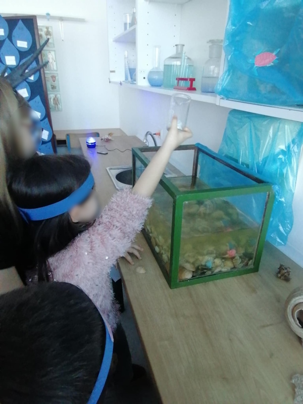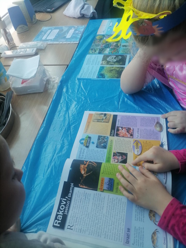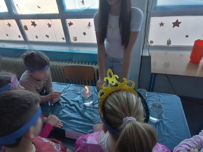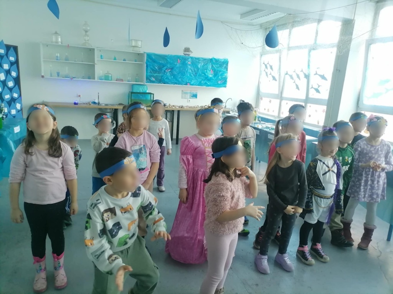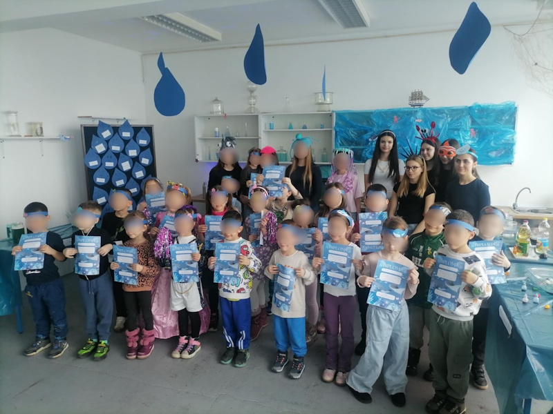 Maskirani prigodnom maskom ušli smo u svijet vode na zanimljiv način gdje su djeca proširila spoznaje o vodi ali i otkrili mnogo više kroz kreativne i edukativne pokuse igrajući se vodenim orkestrom, gorućom vodom, tornadom u boci, stvarali šarene oblake, doživjeli ples meduza, otkrili suhu krpu na dnu mora, utrku boja i još mnogo toga. Nije izostalo niti natjecateljske igre čiji brodić je brži, a sve to i mnogo više o morskom svijetu su ponudile enciklopedije i razni eksponati sa morskog dna. Iznenađenje je bilo i zaplesati u poznatom i djeci omiljenom ritmu na ovu temu.