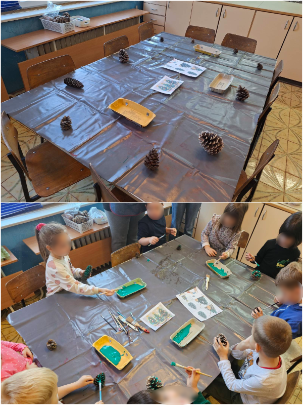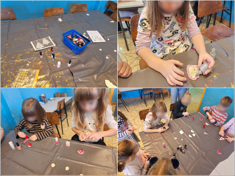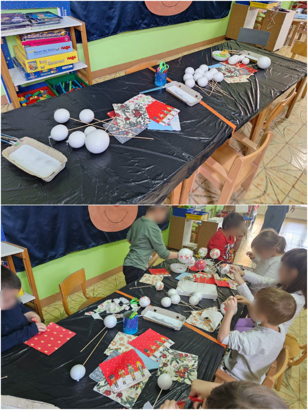 Djeca su izrađivala zvijezde za bor od slamki s puno preciznosti i strpljenja. Posebnu pažnju posvetila su i božićnim čestitkama za roditelje, ukrašavajući ih božićnim motivima od kolaža i posvetama. Veselo su oblikovala božićna drvca od češera i pompona, kombinirajući različite boje i teksture. Različite ukrase za bor izrađivala su od glinamola uz pomoć modli za kolače, koje su potom bojali lakovima za nokte što je većinu djece posebno oduševilo. Također su izrađivali božićne kugle, lijepivši salvete na stiroporne kugle te tako izradili jedinstvene ukrase.