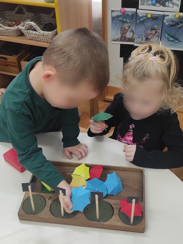 Djeca mlađe vrtičke skupine „Ježići“ sudjelovala su u brojnim aktivnostima kojima su istraživala i upoznavala godišnje doba jesen. Kroz igru, istraživanje i zajedničko iskustvo, djeca su imala priliku promatrati, dodirivati, mirisati i kušati različite plodove jeseni. Istraživala su razlike među plodovima, njihovu boju, veličinu, oblik i teksturu. Vaganjem i uspoređivanjem veličina i količina, te formiranjem skupova, razvijala su početne matematičke pojmove. Sudjelovanjem u likovno kreativnim aktivnostima djeca su oblikovala i stvarala plodove jeseni različitim tehnikama ( slano tijesto, kolaž, tempere, akvarel ), čime su razvijala finu motoriku, kreativnost i osjećaj za boju i oblik. Upoznali su i kišu kao prirodnu pojavu, otkrivali kako ona nastaje, kakve zvukove proizvodi i kako utječe na prirodu oko nas. Tijekom svih aktivnosti djeca su poticana na dijeljenje materijala, čekanj reda i uvažavanje mišljenje drugih, što je pridonijelo stvaranju pozitivne i poticajne atmosfere u skupini.