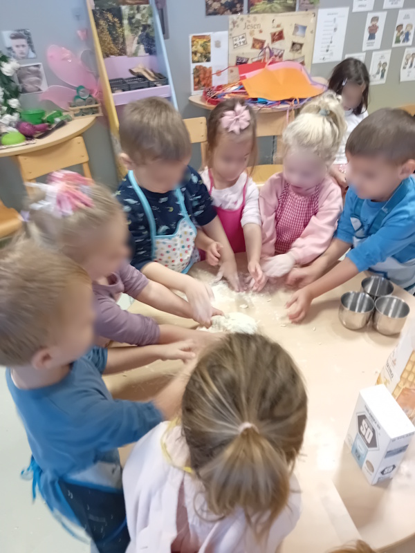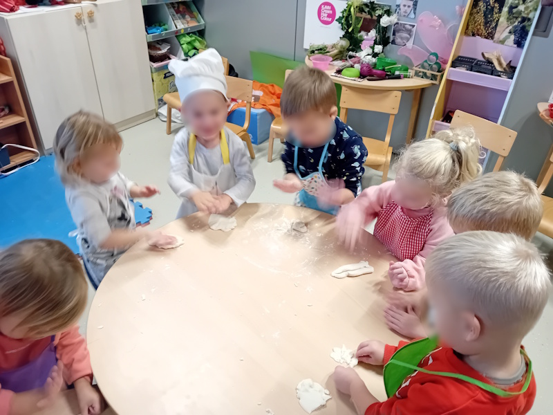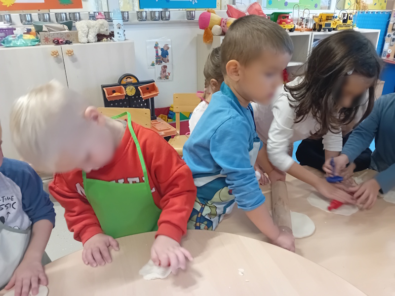 Uz priču i slikovnicu o kruhu i pekarima, najviše veselja donijela nam je aktivnost izrade kolačića od slanog tijesta. Djeca su mijesila, valjala i oblikovala razne oblike razvijajući pritom svoju maštu i motoriku.