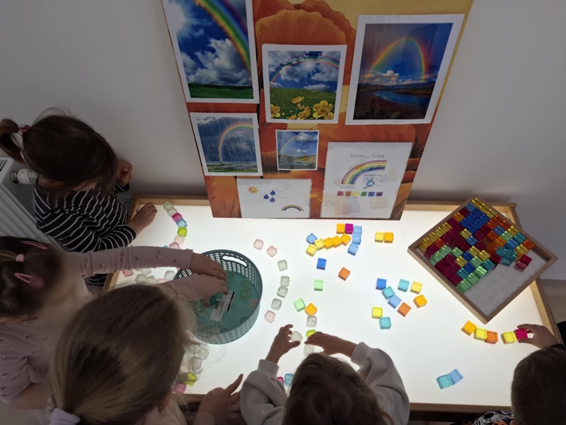 Jedan sasvim običan dan djecu mješovite vrtićke skupine Medvjedići, podcentra Uske njive, iznenadila je duga na nebu iznad našeg vrtića koja je bila poticaj na daljnja istraživanja. Nakon što su u različitim knjigama i dječjim enciklopedijama proučavali nastanak duge u nastavku su slijedili različiti pokusi, koji su se danima ponavljali jer je dječja znatiželja bila velika. Neke od njih smo zabilježili i slikovno te ih možete vidjeti. Na primjer (djeca su davala nazive za pokuse) „duga od bombona“, „duga koja izlazi iz čaše“, „miješana duga od svjetla i vode“… poseban interes izazvao je i svjetleći stol koji je uz pomoć dječje mašte i različitih transparentnih kockica i papira postao „radionica za duge“. Izradom zajedničkog plakata zaokružili smo naša nova znanja o dugi te smo ga izložili ispred naše sobe.