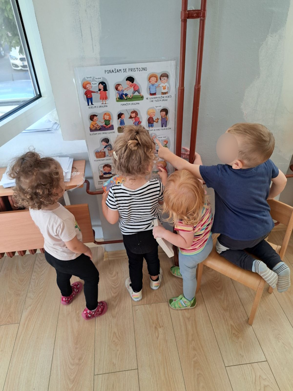 Razgovorom o plakatu s poželjnim ponašanjima djeca su, uz podršku odgojiteljica, učila što znači biti dobar prijatelj. Tijekom tjedna poticali smo različite oblike prosocijalnog ponašanja, poput pomaganja prijatelju tijekom obuvanja, dijeljenja voća, donošenja osobnih stvari te iskazivanja nježnosti zagrljajem. Posebnu pažnju pridavali smo poticanju korištenja „čarobnih riječi“ – izvoli, hvala, molim – i držanju prijatelja za ruku, čime se kod djece razvijaju temelji kulturnog ponašanja i osjećaja međusobnog poštovanja.