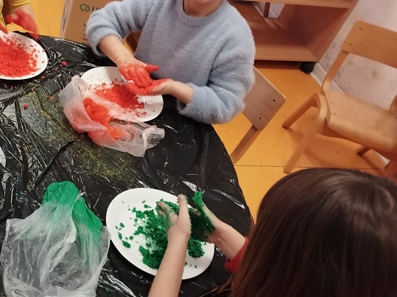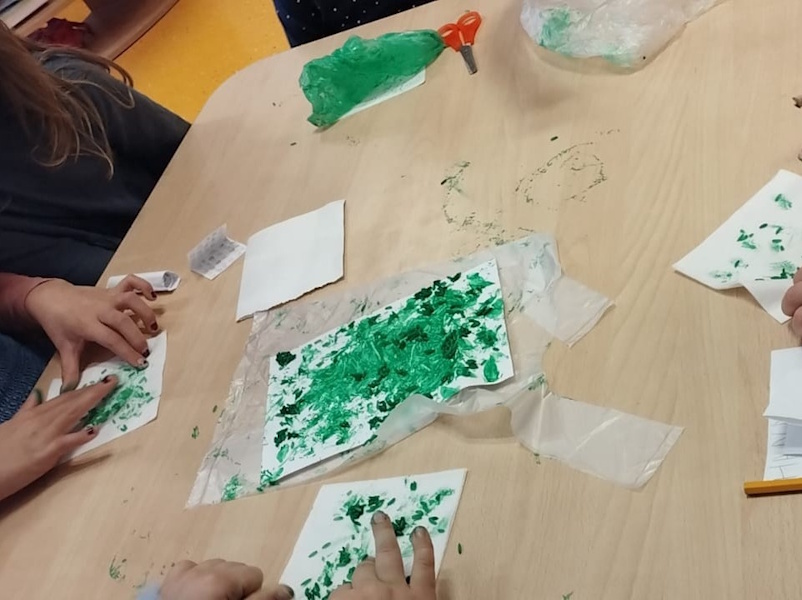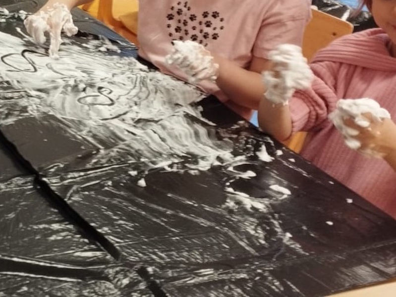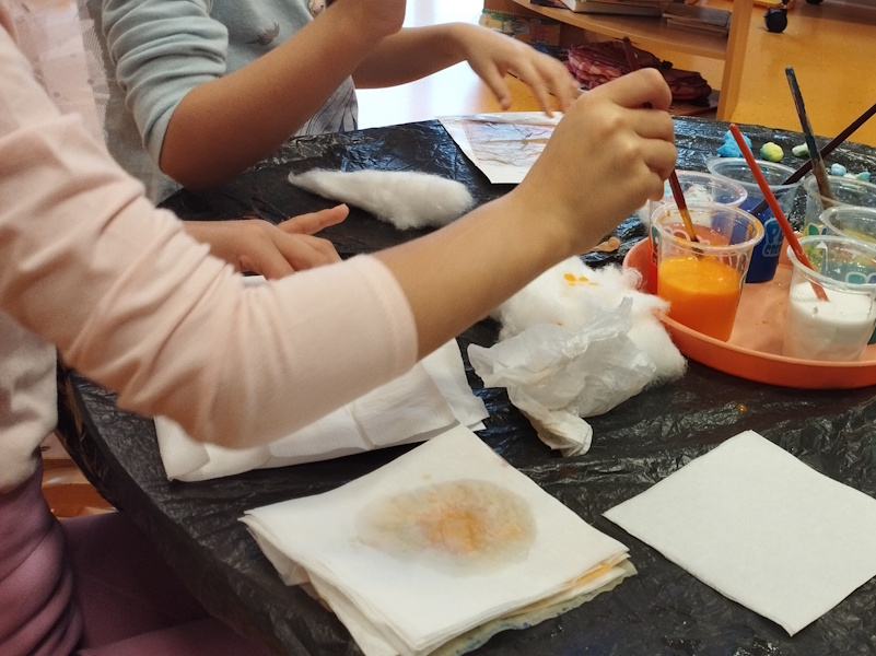 U našoj sobi engleske skupine mračna i hladna studen nije se ni osjetila jer smo ju proveli u istraživanju boja. Istraživali smo miješanje boja, uočavali smo promjene koje se dogode u vodi i razliku u tome kako se boja “zalijepi” na kožu, na papire i ubruse, rižu i na tijesto. Razgovarali smo o tome možemo li bojati sa vatom umjesto sa kistom, što se dogodi kada vatu stavimo u obojanu vodu, kako i zašto vata puna vode ostavlja trag na papiru.
