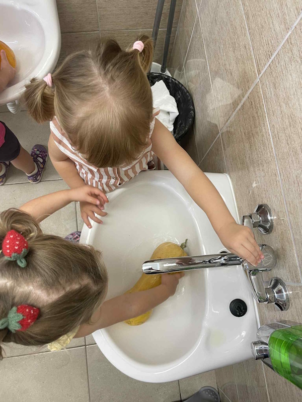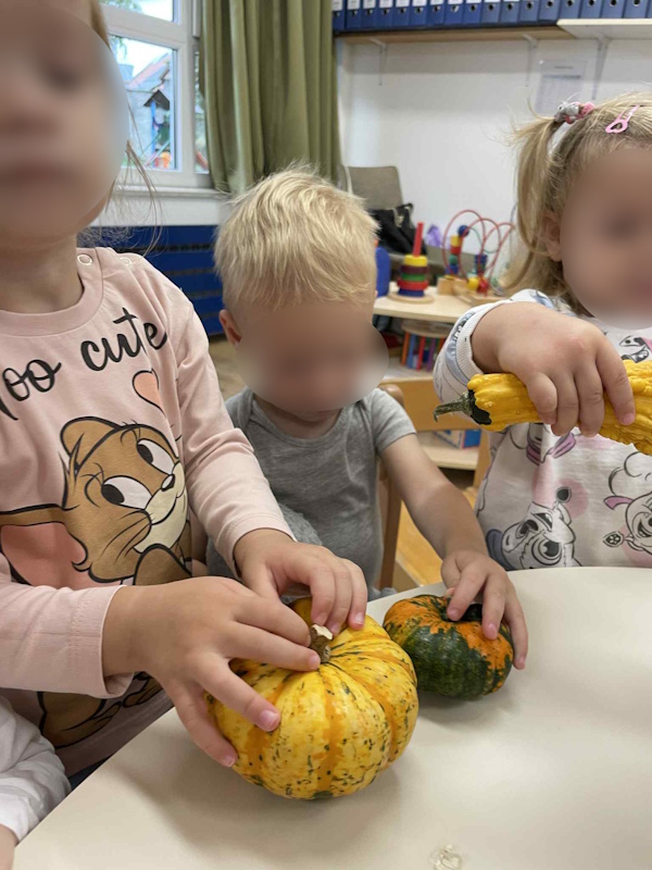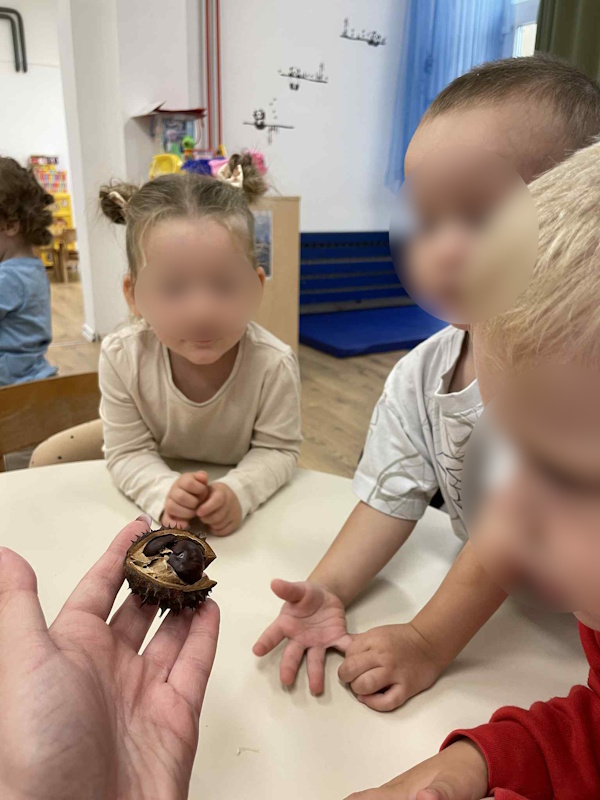 U tjednu od 22. rujna do 26. rujna 2025. obilježili smo prvi dan jeseni u prigodnom ozračju. Roditelji djece odazvali su se pozivu za prikupljanje jesenskih plodova, potrebnih za aktivnosti. Djeca su imala priliku istražiti jesenske plodove poput bundeva, oraha, kestenja, suhog lišća i žireva. Istraživanjem smo proširili spoznaje o teksturi, oblicima, bojama i drugim razlikama u plodovima. U životno-praktičnoj aktivnosti, djeca su donosila bundeve koje su potom oprala od zemlje u toaletu vrtića i postavila ih u garderobu. Time smo potaknuli autonomiju djece i osnažili ih izravnim uključivanjem. Likovna aktivnost protekla je vrlo uspješno jer su sva djeca sudjelovala i pokazala interes. U likovnoj aktivnosti potaknut je razvoj kreativnosti, fina motorika ruku, istraživanje boja i utjecaja vode na nijansiranje te otkrivanje koju boju dobivamo miješanjem više boja. Dječak iz skupine dosjetio se obojiti kesten, koji je bio poticaj na stolu, i napraviti otisak na papiru s pomoću njega. Situacijski poticaj i interes dječaka iskoristili smo za proučavanje smrdljivog martina (Rhaphigaster nebulosa) kojeg je dječak uočio i o tome obavijestio odgojiteljicu. Opisali su kukca kao zelenog, malog i s puno nogu. Nakon proučavanja pustili smo ga van kroz prozor. Ovaj aktivan tjedan obogatio je djecu novim spoznajama, iskustvima i zadovoljenjem potreba djece za pokretom i izričajem, a sve u korist optimalnog razvoja svakog djeteta.