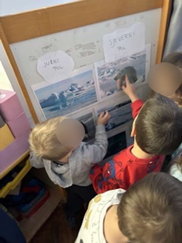 Kroz razgovor, slikovne materijale i tematske igre djeca su otkrivala koje životinje žive na kojem polu. Posebno su ih zainteresirali pingvini i svijet Antarktike. Proučavali su njihov način života, prehranu i vremenske uvjete u kojima žive. U simboličkoj igri „hranili“ su pingvina ribicama, učili o njegovim navikama te uspoređivali životinje s juga i sjevera. Djeca su tako razvijala znanstvenu znatiželju, ali i empatiju prema životinjskom svijetu.