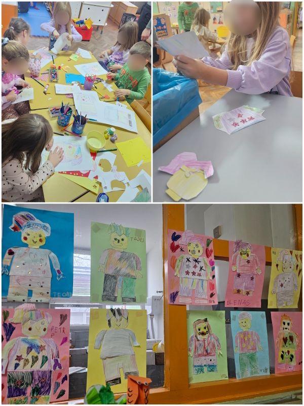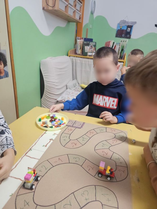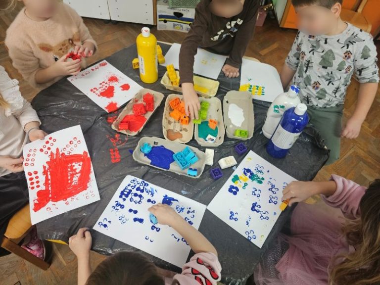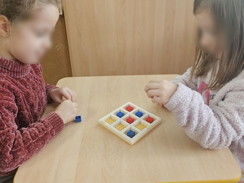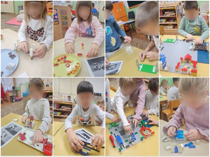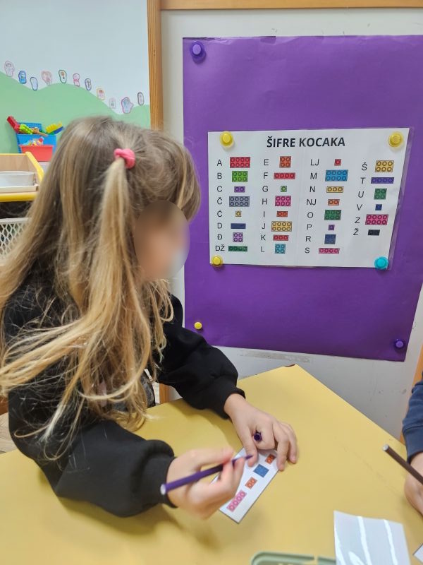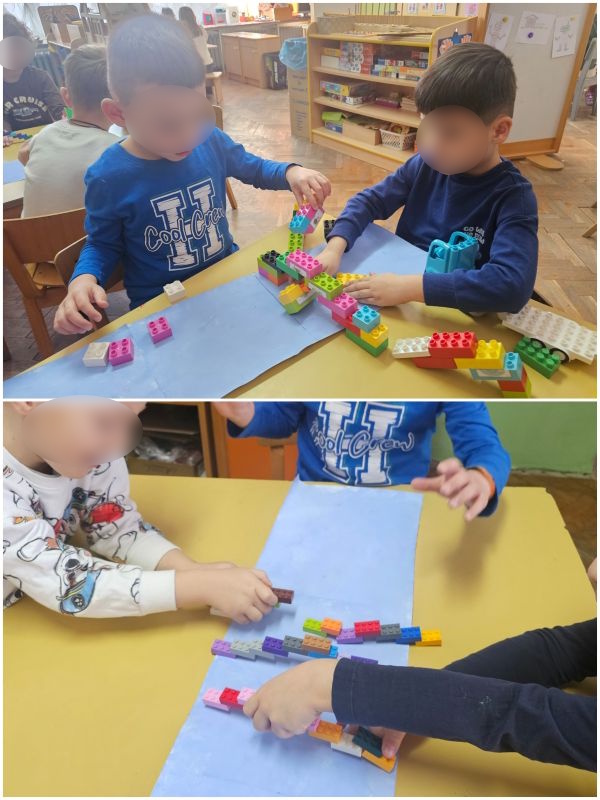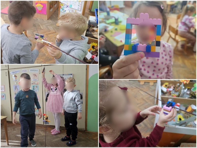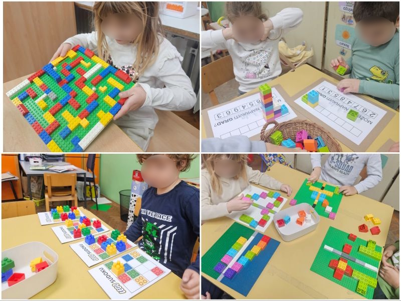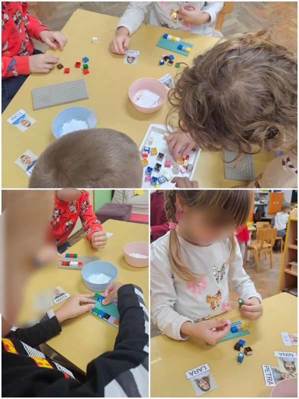 Dane smo započinjali u jutarnjem krugu igrama prepoznavanja boja kockica, ritma kockica te izvođenjem tjelesnih vježbi uz LEGO prepreke. Tijekom dana djeca su se kroz igru i zajedničko istraživanje upoznavala s različitim aktivnostima od društvenih igara poput „Najveći autić“ i „Iks-oks s legićima“, u kojima su razvijala suradnju, dogovor i strateško razmišljanje, do spoznajnih aktivnosti poput „LEGO simetrije“, „LEGO sudoku“ i „LEGO grad“ koje su poticale vizualnu percepciju, logiku i predmatematičke vještine. Građevne i istraživačke igre, „Most preko vode“ i posebno zanimljiva „LEGO žičara“, omogućile su eksperimentiranje i promatranje uzročno-posljedičnih veza, potičući prostorno mišljenje i rješavanje problema. Kreativnost smo razvijali likovnim aktivnostima poput „LEGO žigova“, a početne vještine čitanja i pisanja jačali smo kroz slaganje imena djece od kockica i dešifriranje slova.