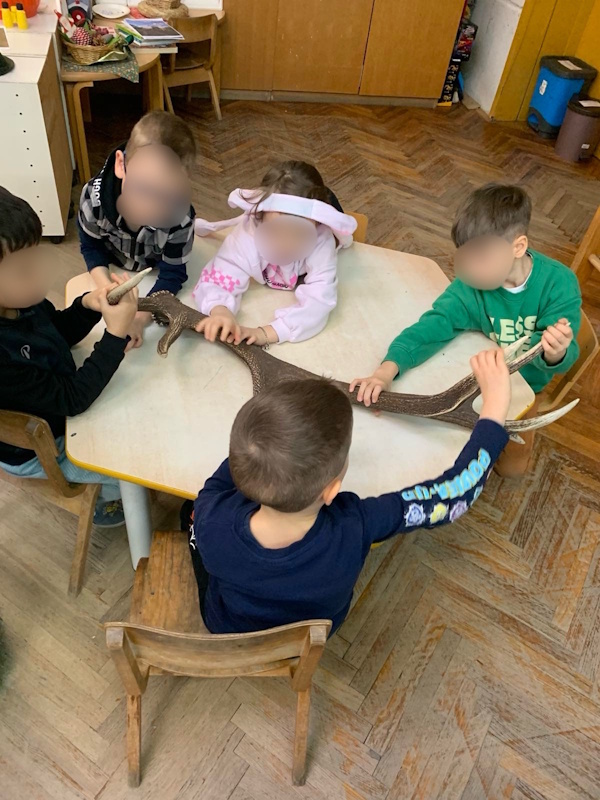 Čitali smo i priču Ježeva kućica koja je potaknula djecu na razmišljanje o šumi kao domu životinja i važnosti brige za okoliš. Posebno oduševljenje izazvali su pravi jelenji rogovi koje je naš gost donio sa sobom. Djeca su ih s velikim zanimanjem promatrala, opipavala i istraživala njihovu teksturu, učeći kako jelenima rastu rogovi i kako ih prirodno odbacuju. Ovo druženje je znatno doprinijelo razvoju spoznaja iz područja prirode i društva te je potaknulo razvoj govora i komunikacije.