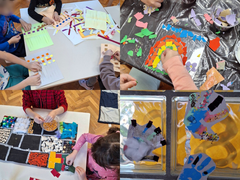 Sljedećeg tjedna istraživali smo osjetilo dodira – upoznavali različite materijale dodirom te ih opisivali, izrađivali šalice i vaze od glinamola, miješali pjenu za brijanje s temperama rukama i promatrali nastanak novih boja. Izrađivali smo taktilnu ploču i taktilne brojeve, igrali taktilni memori s povezom na očima, tkali uz pomoć kolaž papira, bosi hodali po različitim taktilnim površinama, izrađivali mozaik od tjestenine za lazanje.