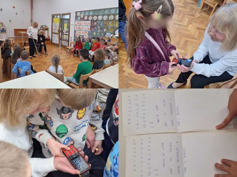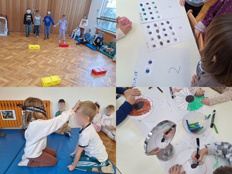 Prvoga tjedna istraživali smo osjetilo vida. Djeca su prepoznavala prijatelje i predmete iz svoje okoline, snalazila se u prostoru s povezom na očima, promatrala poznata likovna umjetnička djela te ih sama slikala temperama. Promatrali smo sebe u zrcalu i crtali autoportrete, promatrali i crtali svoje oči te izbrojili koja je boja očiju najzastupljenija u našoj skupini. Promatrali smo optičke iluzije, a na inicijativu djevojčice I.K. našu smo sobu pretvorili u Muzej iluzija. Tijekom ovoga tjedna ostvarili smo i suradnju s Udrugom slijepih Osječko – baranjske županije s ciljem razvijanja senzibiliteta djece za slijepe i slabovidne osobe. Upoznali pomagala koja koriste u svakodnevnom životu – govorni mobitel i toplomjer, uređaj za prepoznavanje boje odjeće, bijeli štap te Braillevo pismo. Naučili smo kako možemo pomoći slijepim osobama te im poklonili taktilnu sliku, a pokušali smo i svoje ime napisati na brajici.