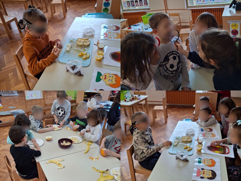 Četvrtog tjedna bavili smo se osjetilom okusa. Kušali smo različite namirnice s povezom na očima i pogađali okuse, rezali smo voće i pripremili voćnu salatu, crtali svoj jezik i omiljenu hranu. Organizirali smo i čajanku tijekom koje smo istraživali mirise i okuse različitih čajeva.