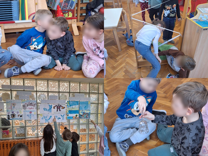 Posljednjeg tjedna istraživali smo osjetilo sluha – prepoznavali glas prijatelja kojega ne vidimo, upoznali osnove znakovnog jezika, igrali igru tišine, pantomime i pokvarenog telefona. Pokušali smo prenijeti zvono bez zvonjave, provlačili se kroz mrežu bez pomicanja zvončića, svirali smo na vodenom ksilofonu, izrađivali svoju gitaru, igrali slušni memori i slušali smo klasičnu instrumentalnu glazbu te slikali što čujemo i osjećamo. Tijekom ovoga tjedna ostvarili smo i suradnju s roditeljima – posjetio nas je tata dječaka D.B. koji nam je donio gitaru i ukulele te nam svirao, a djeca su imala priliku i sama zasvirati.