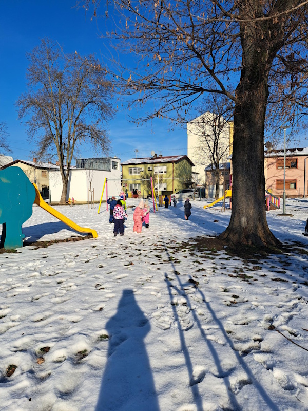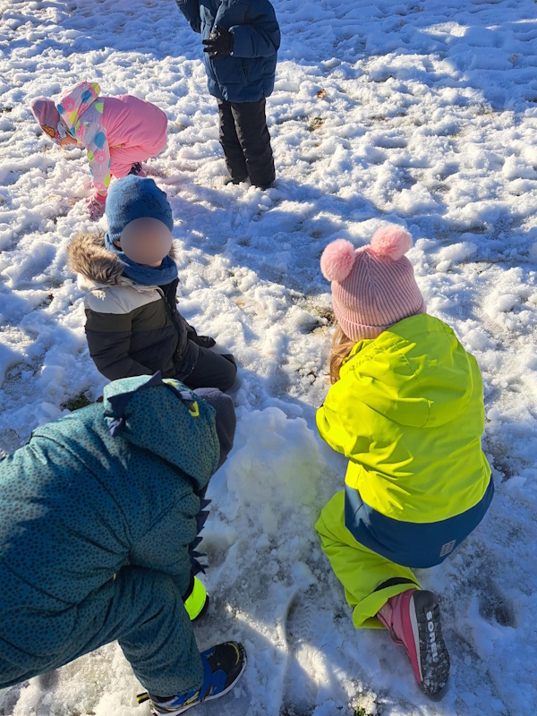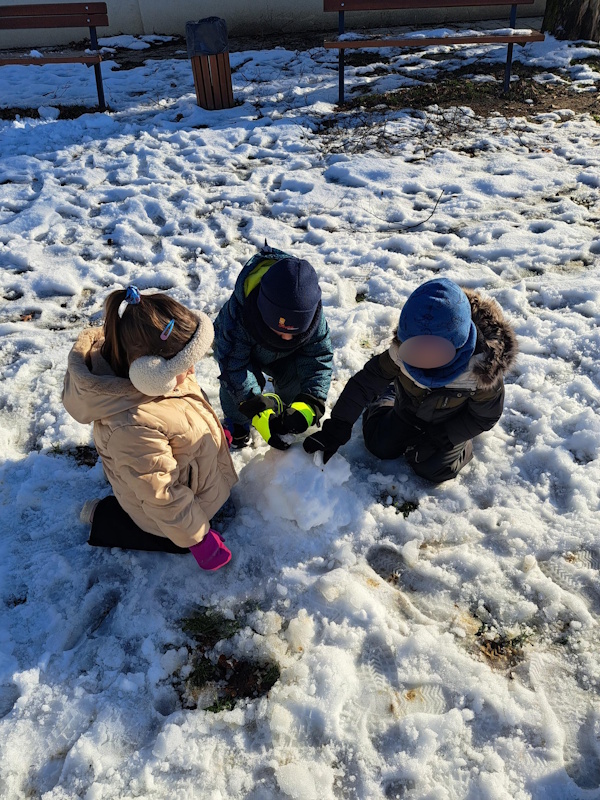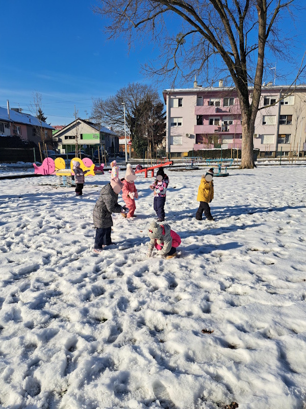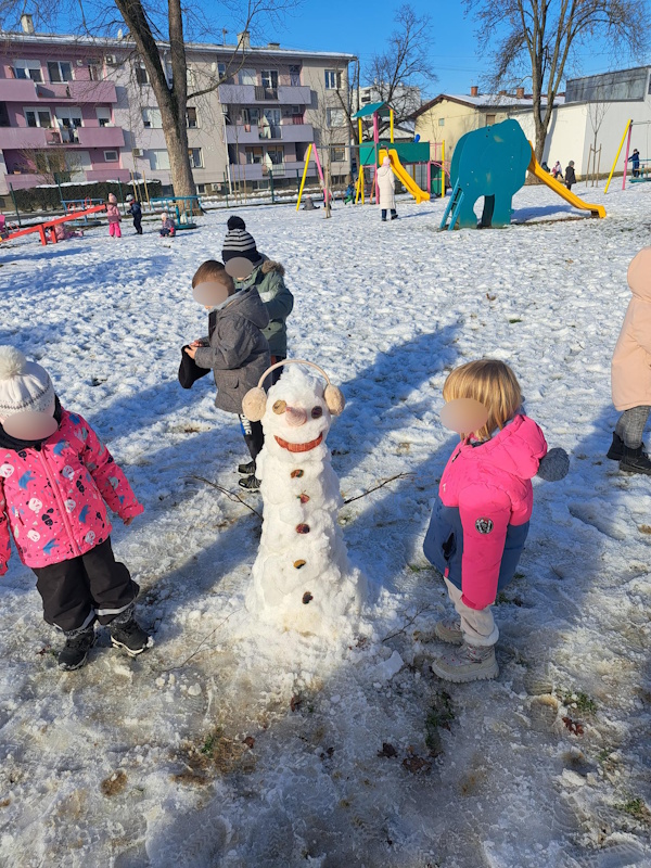 Nakon dugog iščekivanja konačno su zalepršale prve pahulje snijega i sve zabijelile, a djecu mješovite i srednje skupine obradovale. Neobičnim brzinom na prijedlog odgojiteljica a uz prethodnu najavu roditeljima djeca su se spremila za igru na snijegu. Naučili smo kako do male grudice kotrljanjem dobijemo sve veće grude, koje smo spojili i napravili našeg snjegovića.