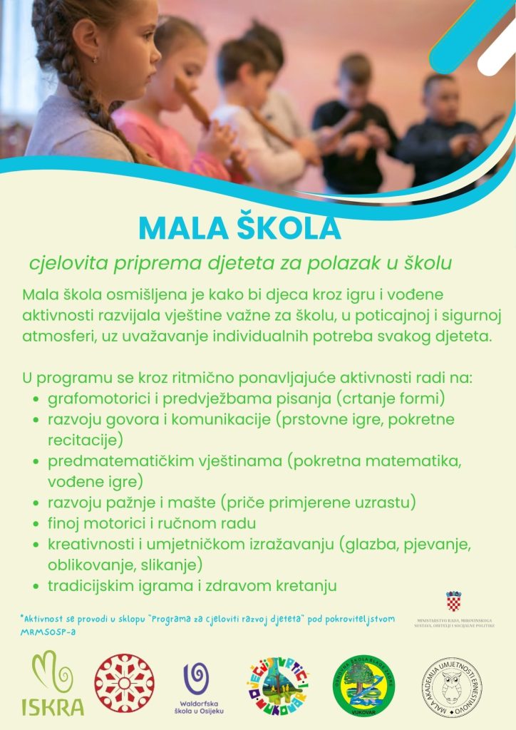 Mala škola osmišljena je kako bi djeca kroz igru i vođene aktivnosti razvijala vještine važne za školu, u poticajnoj i sigurnoj atmosferi, uz uvažavanje individualnih potreba svakog djeteta.