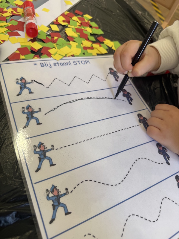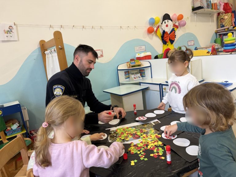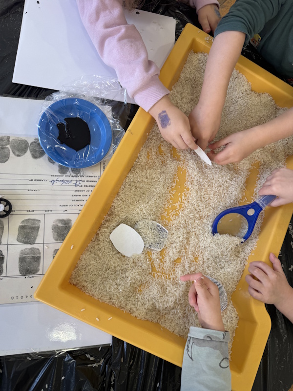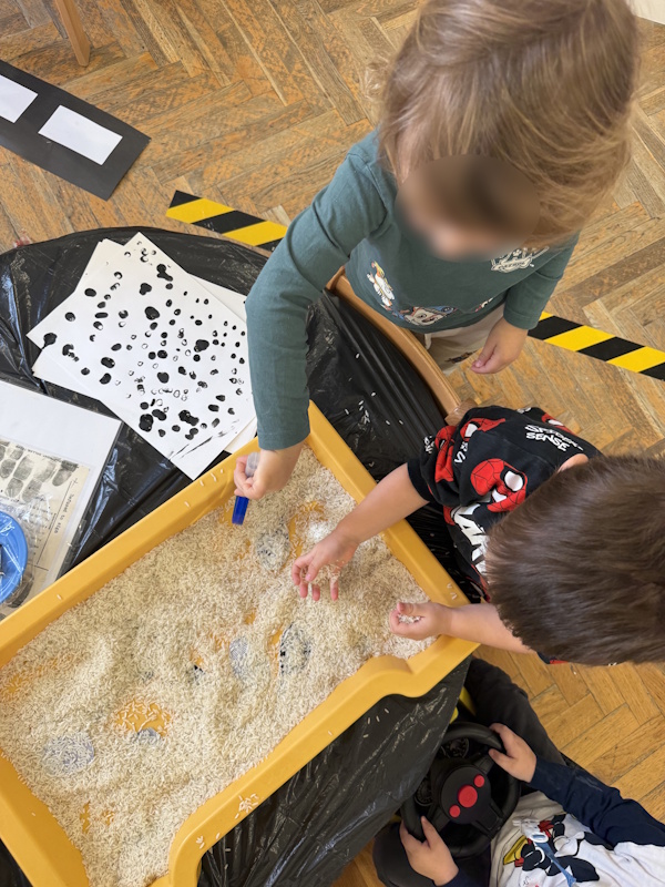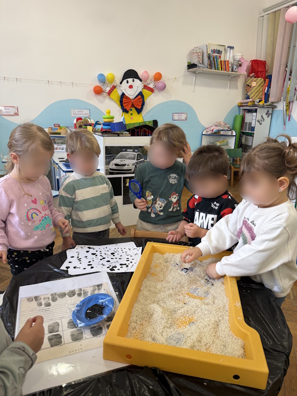 Djeca su tražila tragove stopala i otiske prstiju u riži, zatim su temprom otiskivala svoj prst na papir te ih proučavala povećalom. Učili smo pjesmicu o semaforu, radili grafomotorički zadatak (linija od policajca do lopova), slagali puzzle policajac te bojali autiće od kartonskih tuljaka. Posjetio nas je i policajac.