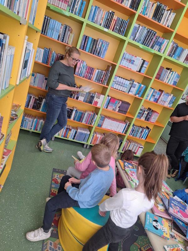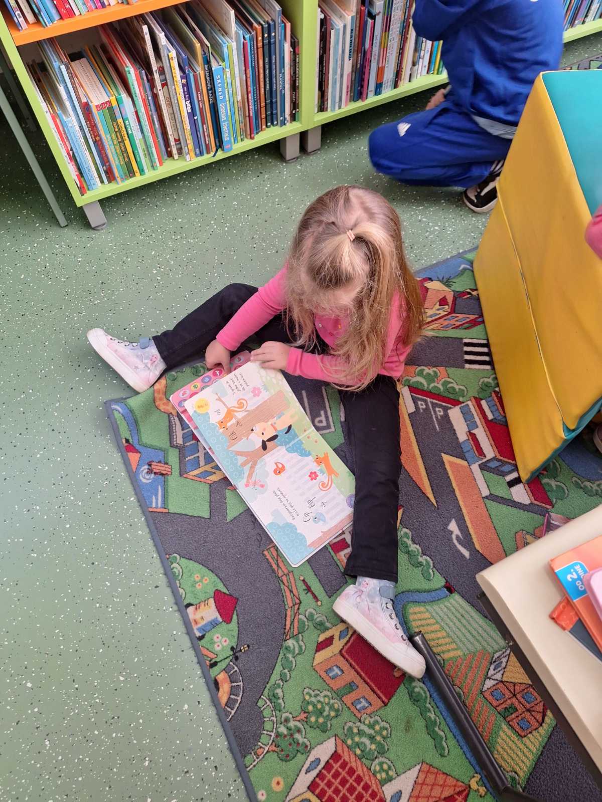 Prilikom posjeta Knjižnici, djeca su imala priliku upoznati kako radi knjižnica, kako se možemo učlaniti te koja prava, ali i obveze proizlaze iz članstva. Knjižničari su djecu proveli kroz dječji kutak gdje smo imali mogućnost proučili mnogobrojne knjige, a knjižničarka nam je i pročitala prigodnu slikovnicu Vjeverica kreće u školu, autorice Sarah Stručić.
