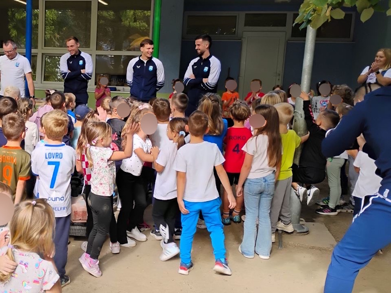 Nogometaši su djeci govorili o timskom radu, prijateljstvu, zdravom načinu života i upornosti, a mališani su imali priliku postavljati pitanja, isprobati osnovne nogometne vještine i zajednički se fotografirati s gostima.
