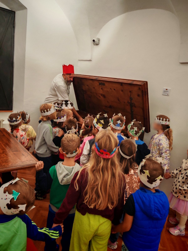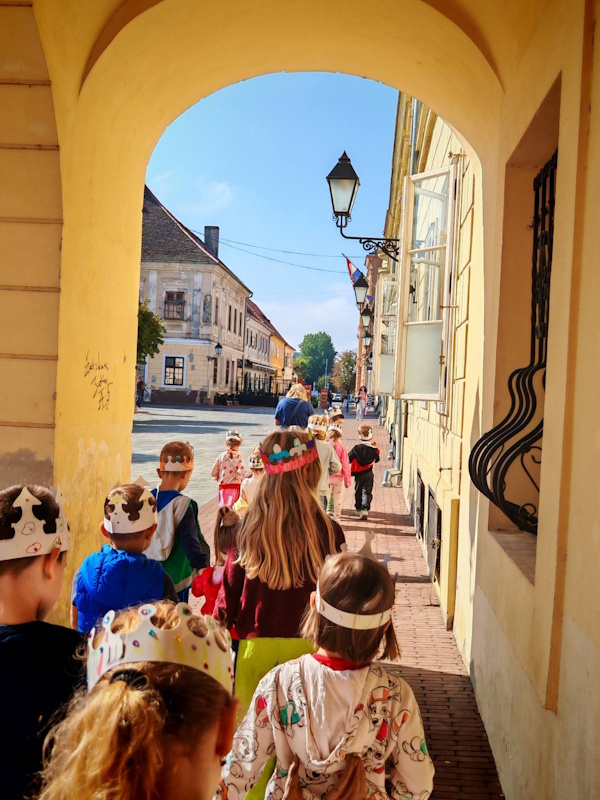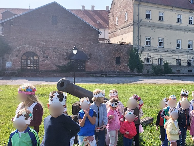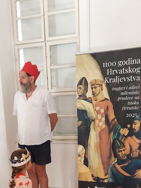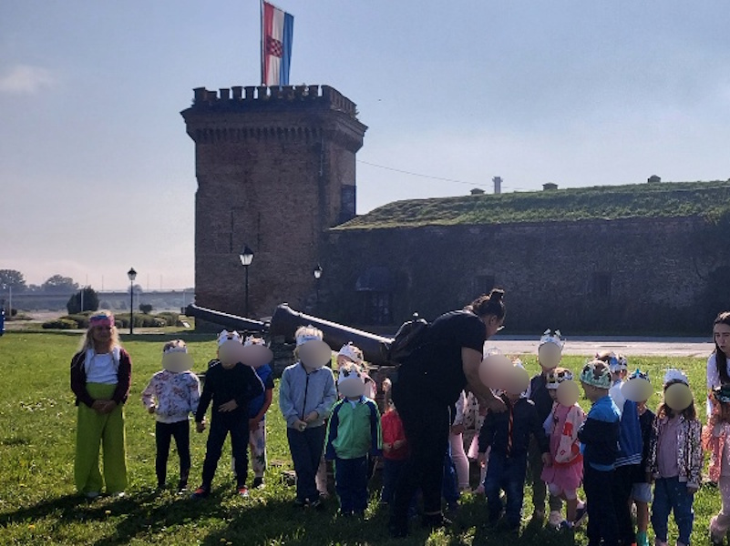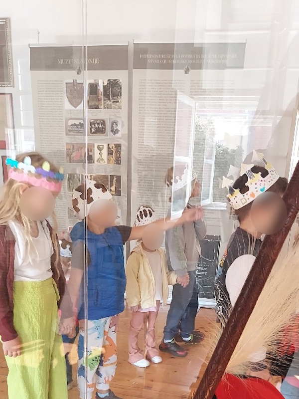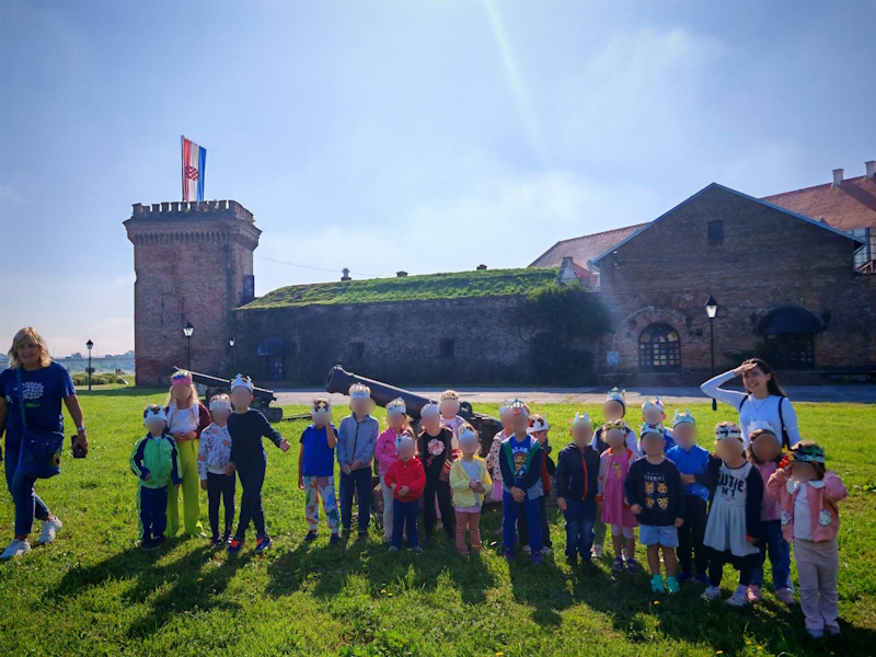 Prihvatili smo poziv kustosa Grgura Marka Ivankovića, djeda našeg Noe i još jednom posjetili Muzej Slavonije ali i novu izložbu „1100 godina Hrvatskog Kraljevstva – tragovi i odjeci milenijske proslave na istoku Hrvatske 2025.“ Izložba je nastala u suradnji 9 slavonskih muzeja koji su predstavili muzejsku građu vezanu uz ovu obljetničku temu. Djeca su na izložbenim panoima istraživali i pronalazili logo izložbe stilizirani reljef „Kralj Tomislav“ djelo akademskog kipara i arhitekta Frane Cote. Saznali su da je motiv na plakatu izložbe akvarel „Krunidba kralja Tomislava“ akademskog slikara Marijana Trepšea. Ovom posjetu prethodile su i aktivnosti u vrtiću u kojima su djeca mogla izraditi svoje krune, saznati nešto više o hrvatskim kraljevima i njihovom životu u dvorcu. Nismo zaboravili posjetiti i postavljenu izložbu namještaja iz razdoblja od 17. do 20. stoljeća svih umjetničkih stilova, obogaćenu izložbom odjevnih predmeta iz tog doba, haljina izrađenih od papira u stvarnoj veličini. Prošetali smo i Tvrđom i zamišljali kako je bilo živjeti u vrijeme kraljeva prolazeći pokraj bastiona, vodenih vrata i topova. Naravno i ovaj put smo se fotografirali pored osječkog ginka koji je za razliku od prošle godine sada bio u zelenom ruhu. Nastavljamo ovim posjetom motivirati djecu na istraživanje hrvatske povijesti i umjetnosti i željno iščekujemo slijedeći poziv na novu izložbu.