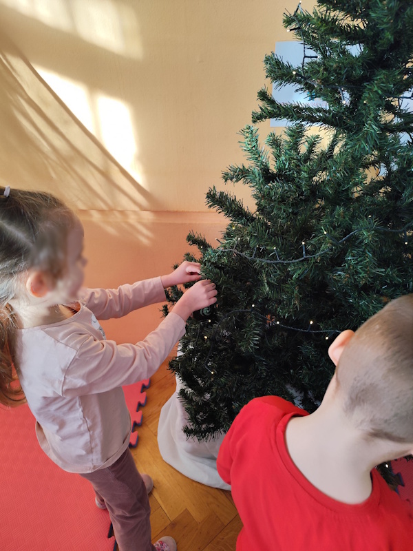 Duh Božića prenijeli smo i u naš prostor. Soba dnevnog boravka zasjala je uz pomoć raznih ukrasa koje su djeca s veseljem postavljala. Posebno nas raduje što su se u pripreme uključile i obitelji – djeca su kod kuće, zajedno s roditeljima, izrađivala božićne kuglice koje će u narednim danima krasiti veliki bor u holu vrtića.