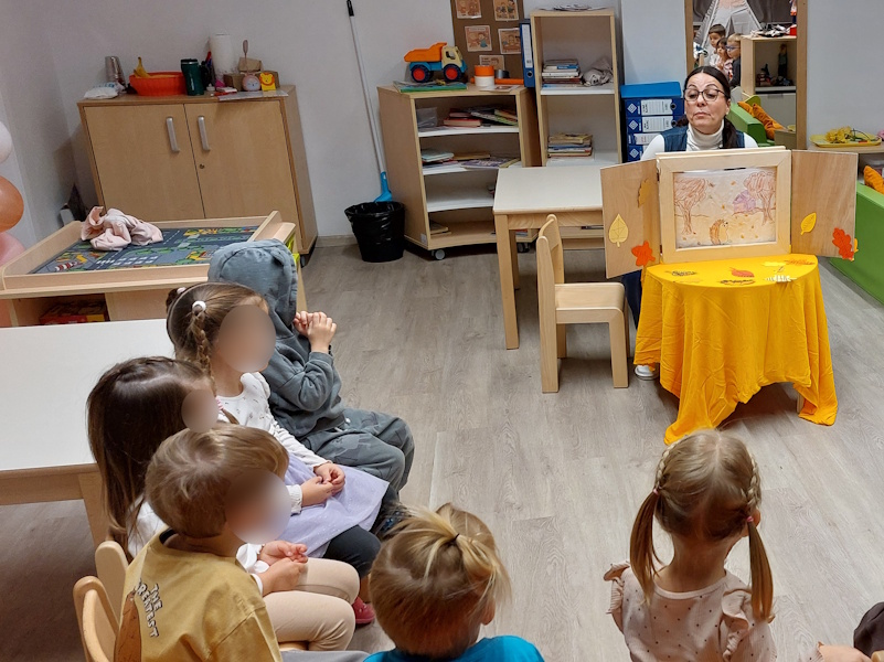 Također, skupinu je posjetila kolegica odgojiteljica, koja je djeci predstavila priču „Jesen pred ježevom kućicom“ koristeći tehniku kamišibaj. Djeca su s velikim zanimanjem pratila priču, promatrala ilustracije i verbalno reagirala na sadržaj.