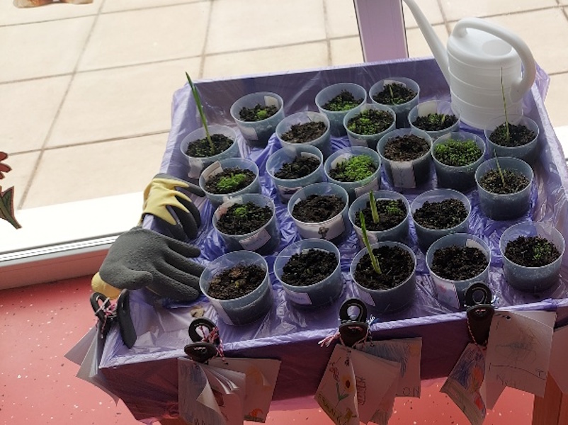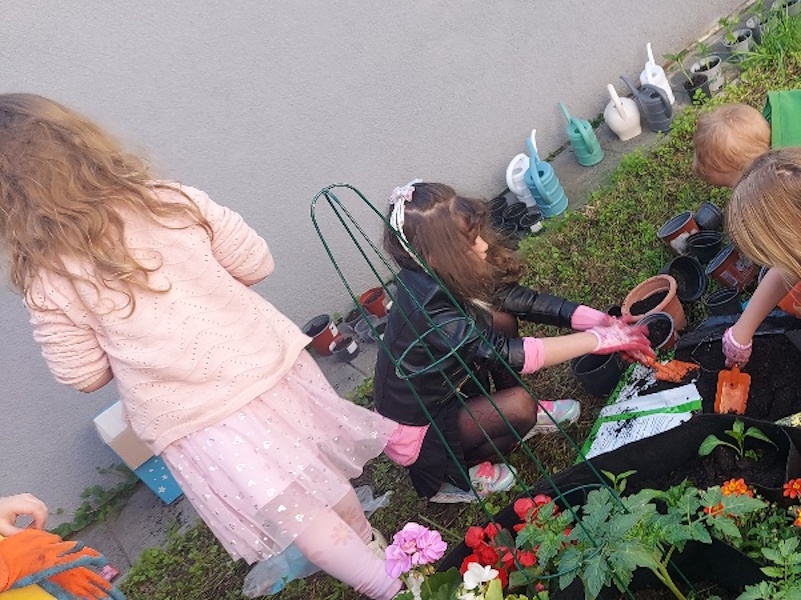Na roditeljskom sastanku vjerske skupine roditelji su jednoglasno prihvatili prijedlog i ideju da od atrija uz njihovu pomoć i pomoć djece vjerske skupine osmislimo vrt u kojem će djeca moći saditi voće(jagode, maline..). povrće (rajčicu, salatu, luk, krumpir, mrkvu, ciklu, mahune, grašak..), začinsko bilje i sl. i cvijeće u kontejnerima za sadnju. Sutradan je jedan tata već pokosio atrij, a pristigle su i prve donacije: zemlja za cvijeće, kontejneri(manji, prenosivi) za sadnju, sadnice cvijeća, povrća, alat za rad u vrtu, zaštitne rukavice, kućica za ptice, mali hotel za kukce, a roditelji jednog dječaka su izradili i donirali kućicu za alat. Djeca su prema dobrovoljnom odabiru vodila brigu o posađenim biljkama: zalijevala, plijevila, promatrala rast i razvoj biljki. Kada su se pojavili plodovi, napravili smo i malu berbu i ponijeli plodove kući (rajčice šeri, jagode, cikla, krumpir). Na početku ove godine dogovorili smo i nastavak ovog projekta i posadili lukovice cvijeća i povezali sa vjerskim sadržajima :