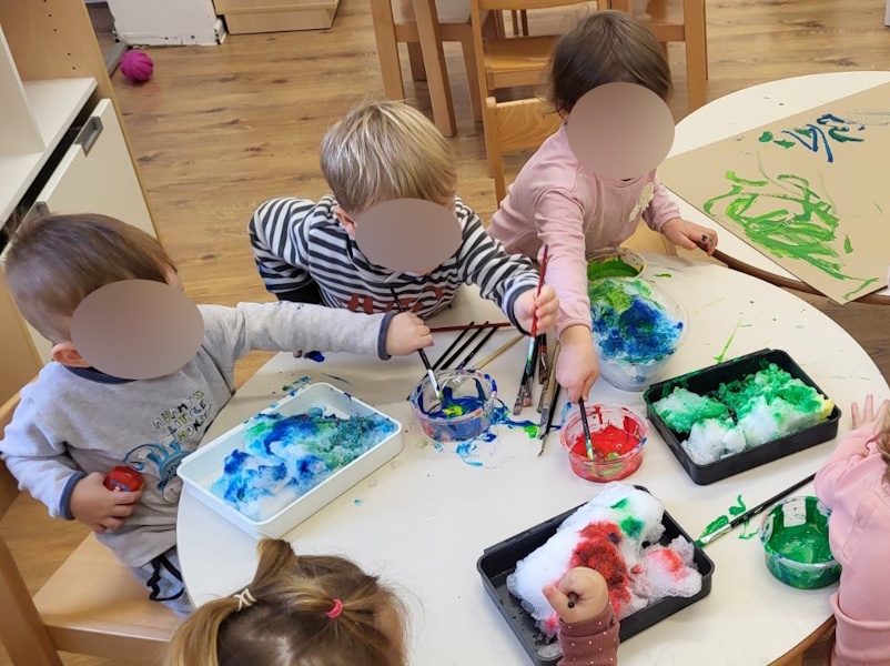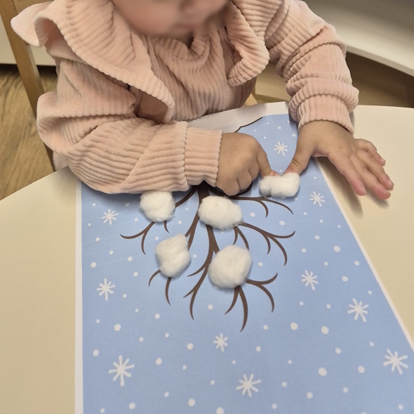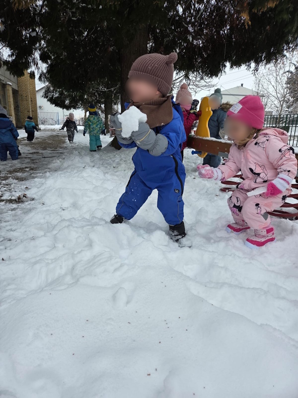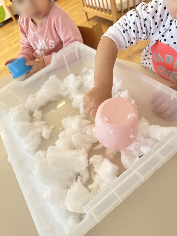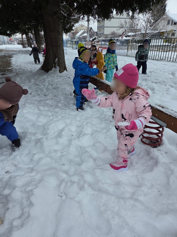 Djeca mlađih jasličkih skupina sudjelovala su u manipulativnim aktivnostima premještanja snijega iz posude u posudu pomoću žlica, lopatica, čime se poticao razvoj fine motorike, koordinacije oko-ruka i početno razumijevanje uzročno-posljedičnih veza. Senzorne aktivnosti omogućile su djeci istraživanje temperature, strukture i promjena snijega, potičući znatiželju, koncentraciju i spontano istraživanje. Također, djeca su imala priliku promatrati što se događa sa snijegom kada dođe u doticaj sa temperom, tako što su bojali snijeg.