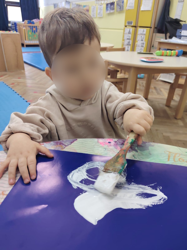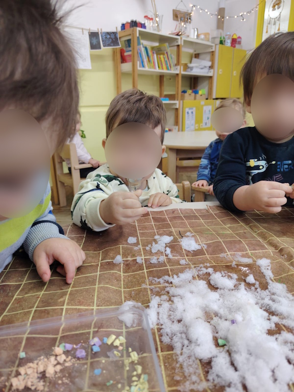 Djeca su snijeg istraživala i u sobi i na otvorenom. Dodirivali su ga, ispitivali njegovu hladnoću i teksturu, utiskivali ga dlanovima te pokušavali oblikovati grude. U sobi dnevnog boravka posebno ih je zaintrigirao trenutak kada se snijeg počeo topiti i na njegovu je mjestu ostala voda. Ovaj smo trenutak prenijeli na papir pa su djeca bijelom temperom naslikala „otopljenog snjegovića“.