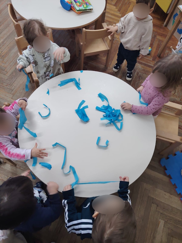 Razgovarali smo o pahuljicama i saznali da se snijeg sastoji od mnoštva sitnih pahulja. Djeca su ih ukrašavala kuglicama od krep-papira, razvijajući finu motoriku i preciznost. Svojim prstićima stvarali smo i „snježnu oluju“ na velikom papiru koristeći tempere i slobodan pokret.