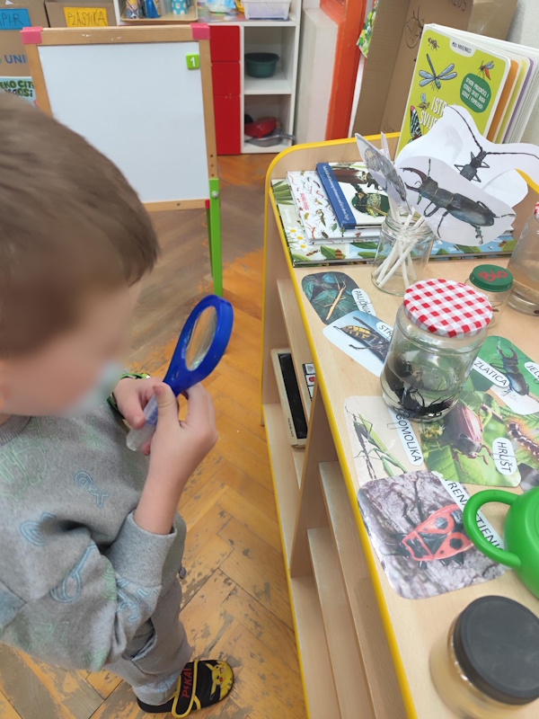 Djeca su s velikim zanimanjem promatrala kukce pomoću povećala i mikroskopa Easi-Scope. Ovakav način istraživanja omogućio im je da uoče detalje koje inače ne bi mogli vidjeti – sitne nožice, uzorke na krilima i razlike među vrstama. Promatranje je potaknulo znatiželju, postavljanje pitanja i razvoj istraživačkog duha.