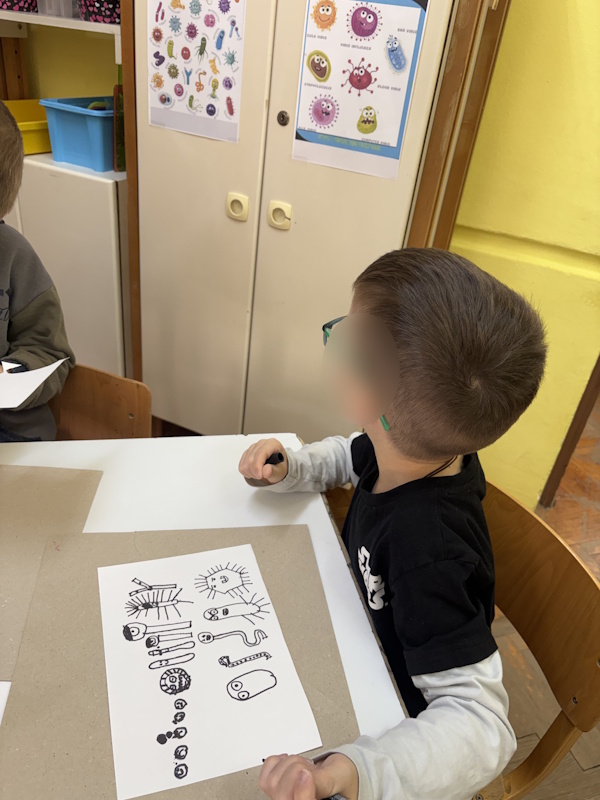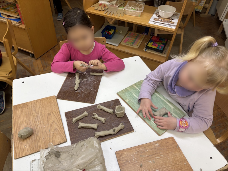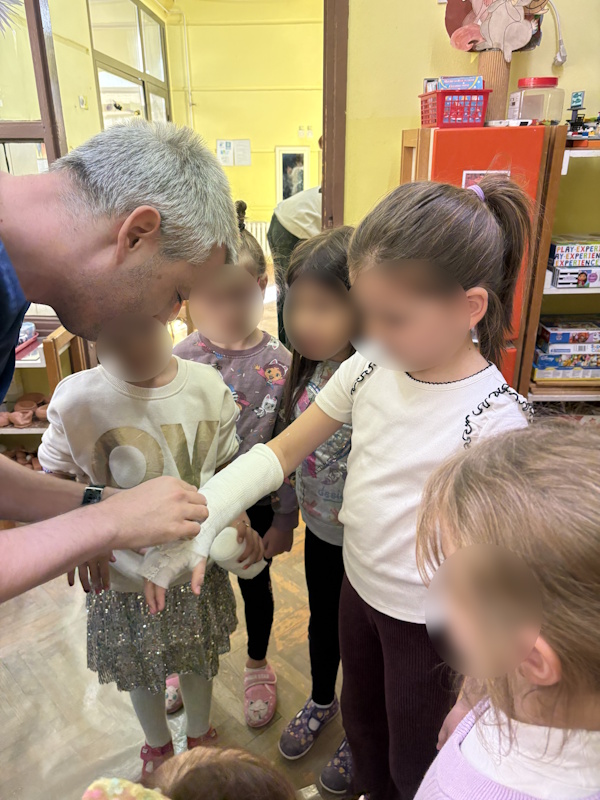 U sobi smo formirali centar liječnika opremljen krevetom, stetoskopima i zavojima. Posebno iskustvo bio je posjet oca ortopeda koji je djeci demonstrirao postavljanje gipsa i objasnio ulogu kostiju u tijelu. Nakon demonstracije, djeca su vježbala preciznost i finu motoriku „šivajući rane“ pomoću slamki i konca.