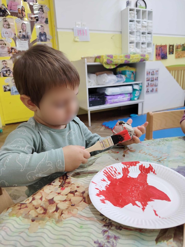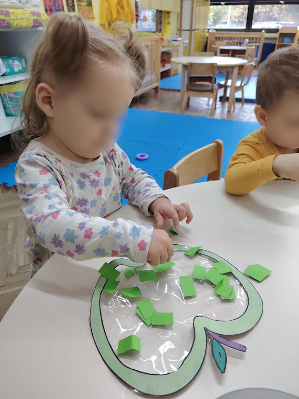 Slušali smo recitacije i pjesmice o jabukama. U kreativnim aktivnostima, načinili smo drvo jabuke bojeći kartonske kutije crvenom temperom. Drvo jabuke sada krasi naš hodnik garderobe. Finu motoriku vježbali smo lijepljenjem papirića na ljepljivi papir, a pokušali smo prepoznati osnovne boje i ubacivati loptice određenih boja u odgovarajuće rupe.
