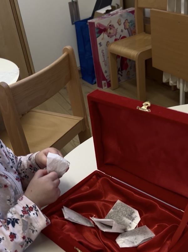 Srijeda je bila za osluškivanje i primjećivanje svijeta koji nas okružuje. Jutarnji smo krug iskoristili za igru tišine sa zvečkom koju smo prvo snažno tresli, a zatim smo ju u tišini prosljeđivali prijatelju pored sebe čime smo ujedno vježbali samokontrolu, strpljenje i preciznost pokreta.