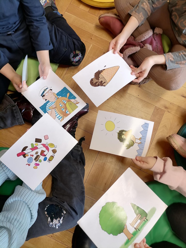 Djeca su u grupama prema nizu slika stvarala priču o dječaku Peri. Maštovitu priču su prikazali zajedničkim crtežom i tako stvorili slikovnicu. Osim aktivnog slušanja, poticanja pamćenja, mašte, govora i kreativnog crtanja mogli su razvijati su i socijalne vještine pa tako ponovili pravila kako strpljivo čekati svoj red, uvažavati drugoga, a jednako tako biti važan i neizostavan dio ekipe. I u ovoj radionici nije izostala igra kroz koju djeca rado uče.