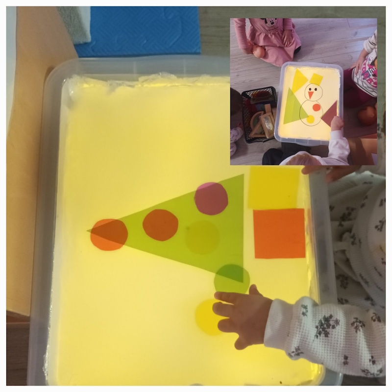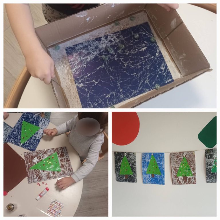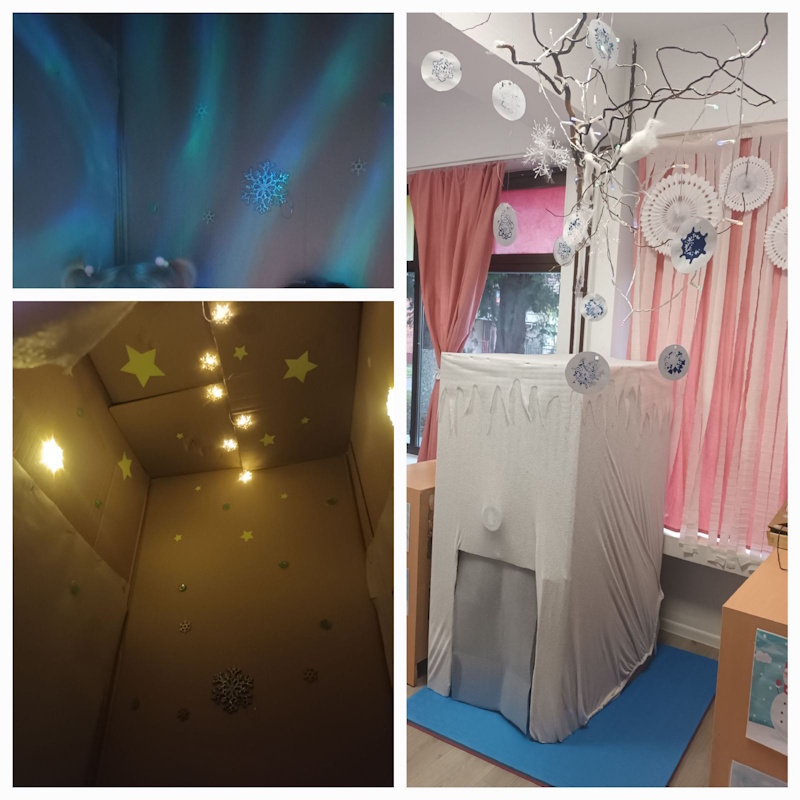 Provodili smo stolno–manipulativne aktivnosti koje su poticale finu motoriku, koordinaciju šake i oka te istraživanje tekstura i oblika. Uz to smo organizirali kineziološke aktivnosti, kroz koje su djeca uživala u kretanju, imitaciji zimskih radnji te razvoju ravnoteže i koordinacije. Uključili smo i istraživačke aktivnosti, gdje su djeca eksperimentirala s različitim materijalima koji simboliziraju snijeg i led, promatrala promjene pod utjecajem svjetla, dodira i pokreta te razvijala znatiželju. Kroz govorne i jezične aktivnosti poticali smo bogaćenje rječnika, opisivanje zimskih motiva, imenovanje pojava te kratke razgovore o doživljajima vezanim uz snijeg. U području likovnog i likovno-kreativnog izražavanja djeca su stvarala snježne motive različitim tehnikama, razvijajući maštu, kreativnost i simboličku misao. Poseban doživljaj pružila je naša “zimska soba” – zimski planetarij, prostor obogaćen svjetlosnim efektima u kojem su djeca promatrala odbljeske raznih svjetala, pahuljica, fluorescentnih kamenčića te “polarnu svjetlost” stvorenu reflektorom. Ova aktivnost potaknula je istraživanje, opuštanje i estetski doživljaj zimskog ugođaja.