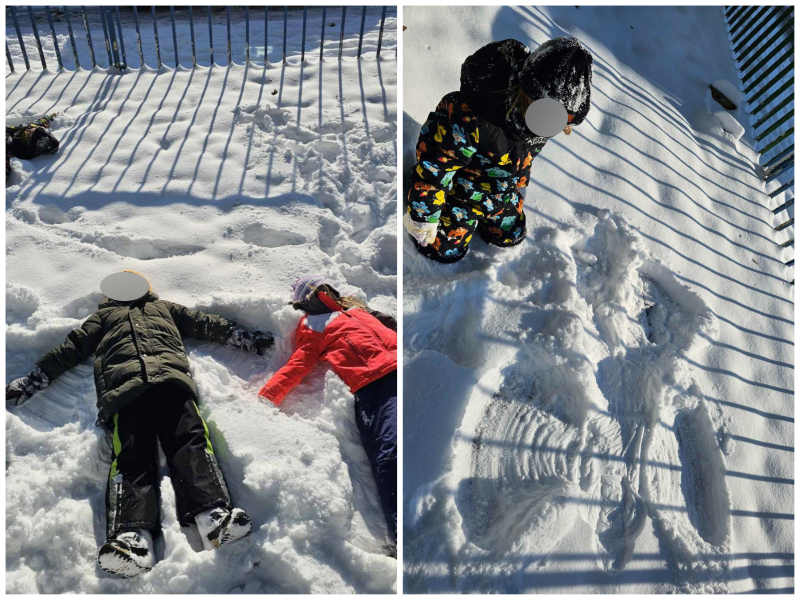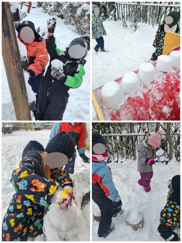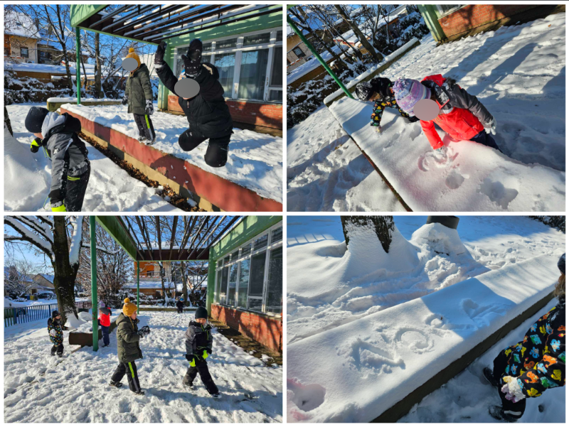 Zimske vremenske prilike iskoristili smo kao vrijednu priliku za učenje kroz igru, boravak na svježem zraku i zajedničko doživljavanje zimskih radosti. Snijeg je potaknuo djecu na spontano stvaranje raznovrsnih igara na dvorištu. Djeca su se samostalno organizirala u igrama grudanja i lovice, gradila snježne kule, pravila snježne anđele, skakala u snijeg te lopatala, čime su razvijala motoričke sposobnosti, maštu i suradničke odnose.
