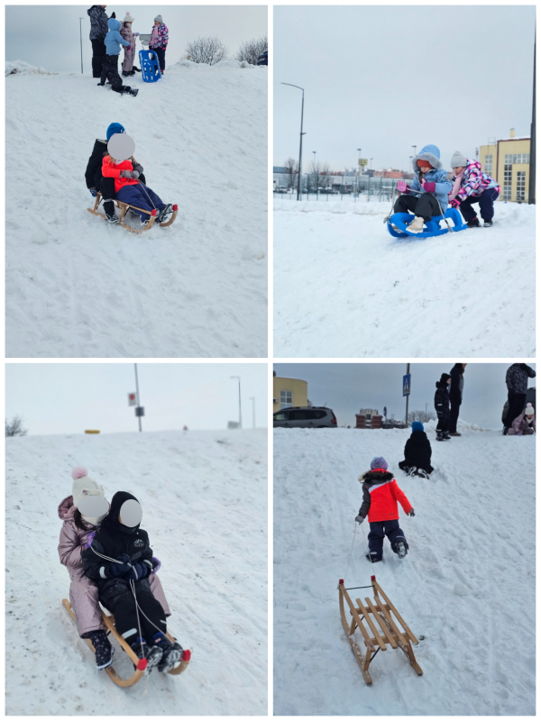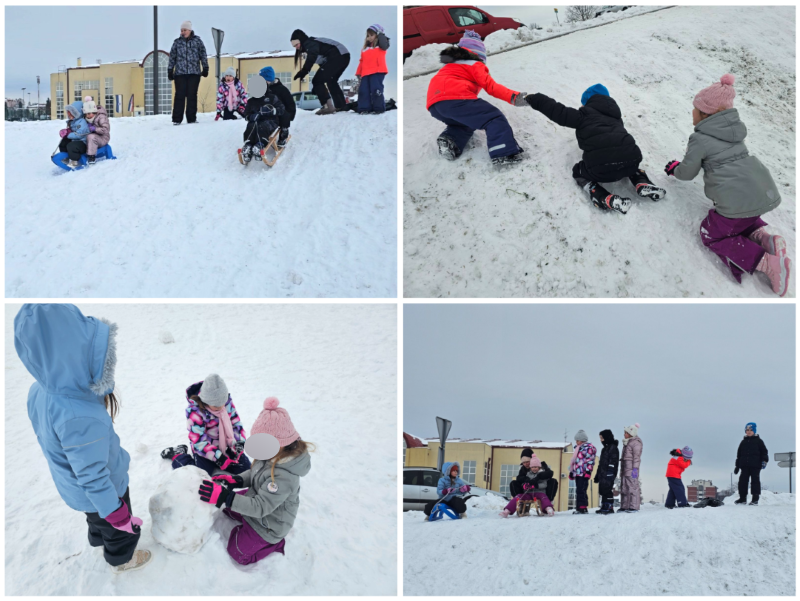 Poseban doživljaj predstavljalo je sanjkanje u blizini vrtića, u kojem su sudjelovale djeca iz skupina „Pužići“ i „Pilići“. Uz podršku roditelja, koji su donijeli sanjke, djeca su učila dijeliti, čekati red i međusobno se dogovarati. Tijekom sanjkanja djeca su si međusobno pomagala pri penjanju natrag uz uzbrdicu te su se izmjenjivala u povlačenju sanjki prema vrhu, razvijajući osjećaj odgovornosti, solidarnosti i timskog rada. Kao dodatni poticaj predložena je natjecateljska igra u kojoj su se dvoje djece spuštalo na plastičnim, a dvoje na drvenim sanjkama. Parovi su se istovremeno spuštali niz padinu i natjecali tko će biti brži, dok su ostala djeca promatrala, uspoređivala brzinu sanjki i iznosila svoja zapažanja. Na taj se način poticala pažnja, zaključivanje i razumijevanje jednostavnih uzročno-posljedičnih odnosa, uz njegovanje pozitivnog i zdravog natjecateljskog duha.